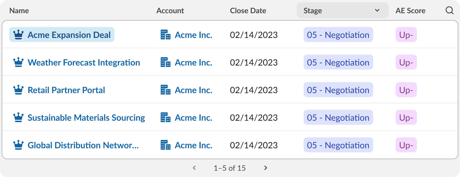 - A Data Table listing open opportunities with status and ARR