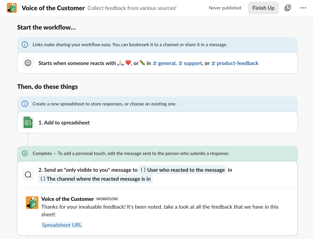 With Slack’s Workflow Builder and Google Sheets connector, you can create a feedback pipeline that captures everything automatically. Here’s how: