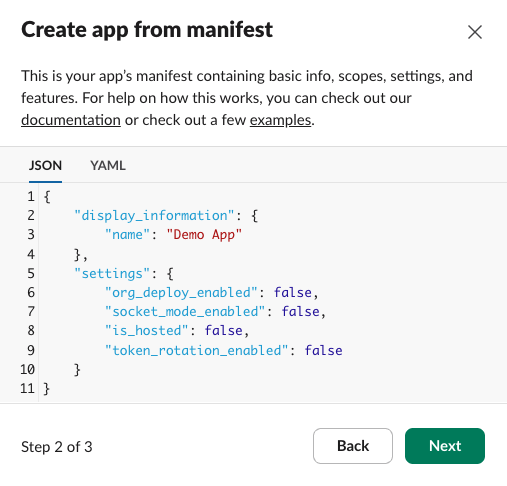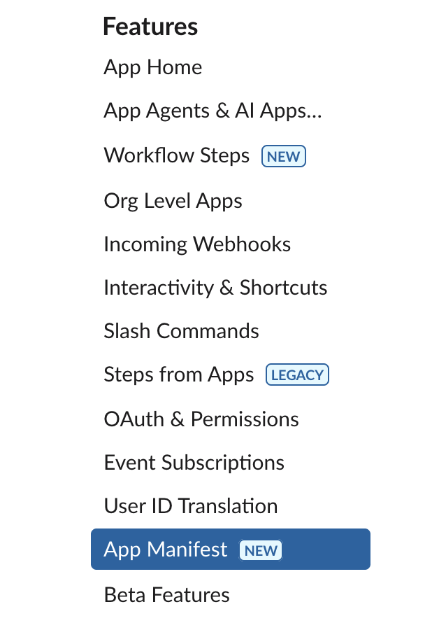 All Slack apps have an app manifest, which serves as the blueprint for the app. There are two places to interact with these configuration settings: the manifest file (either as a JSON or YAML) and your app’s configuration page. Using both of these in concert gives you the ability to not only effectively configure your app, but also to play around with settings and features to create the best version of your app.