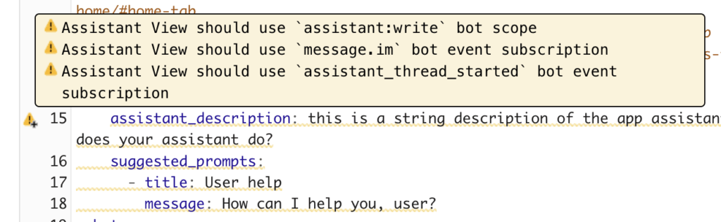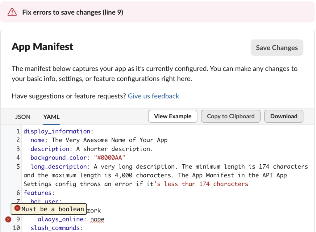 Throughout this process, every time I make a change to the manifest, I go to the App Settings UI and upload the working draft. If you forgot to lint via the Slack CLI (which happens to the best of us, I’d know), the UI has helpful functionality for error checking. It will often give excellent information on what needs to happen to correctly configure your app.