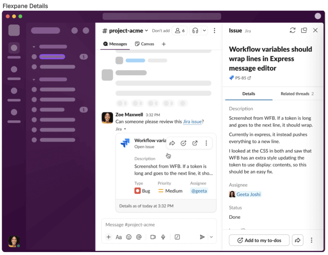 I’m a huge fan of those buttons by the way. They let me edit, approve, or otherwise take action in Slack and keep going with my day. Work objects also keep conversations connected, making it easier to keep track of who said what and where. No more crosslinking to external docs, tickets, or other resources that can get easily lost. Searching in Slack is great, but trying to remember what to search for is less so.