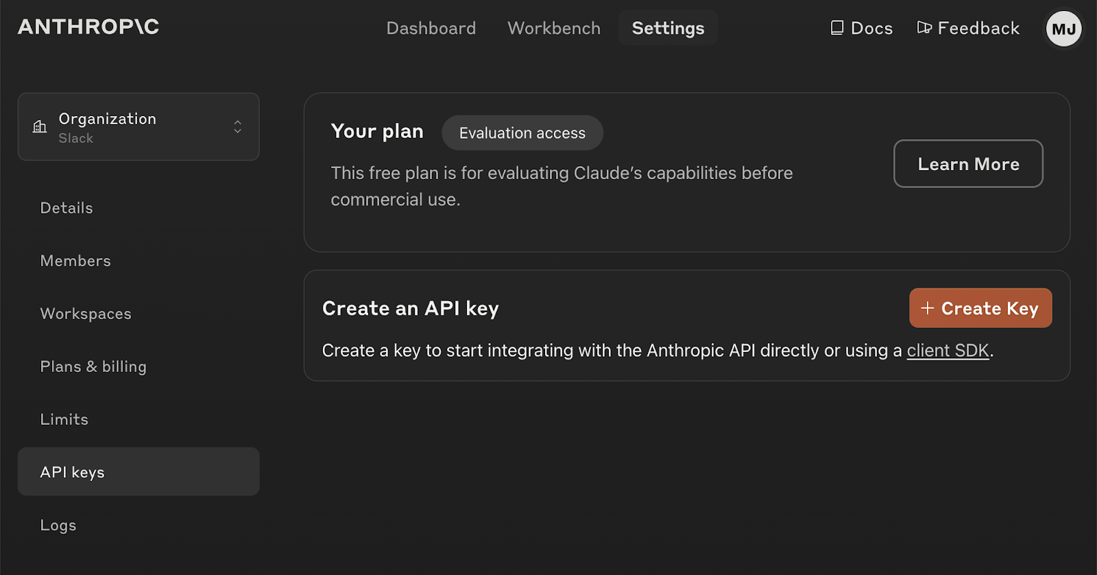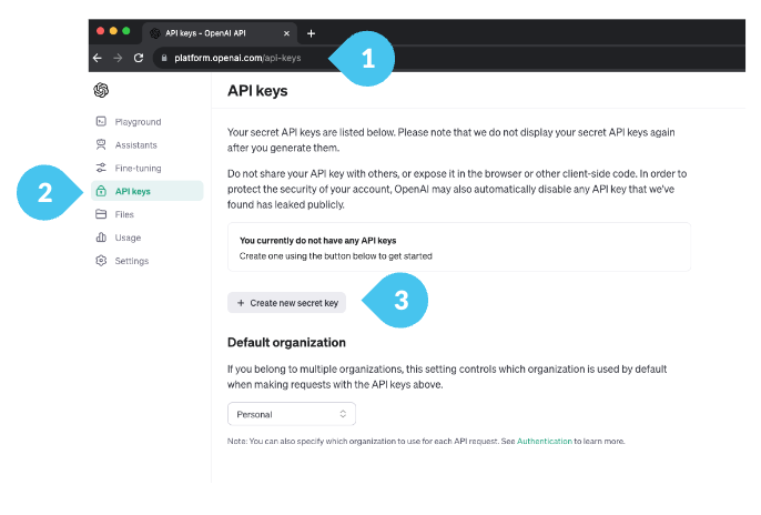 Generative AI services (like OpenAI and Anthropic) require an API key to authenticate requests. Let’s get set up with one of these platforms.