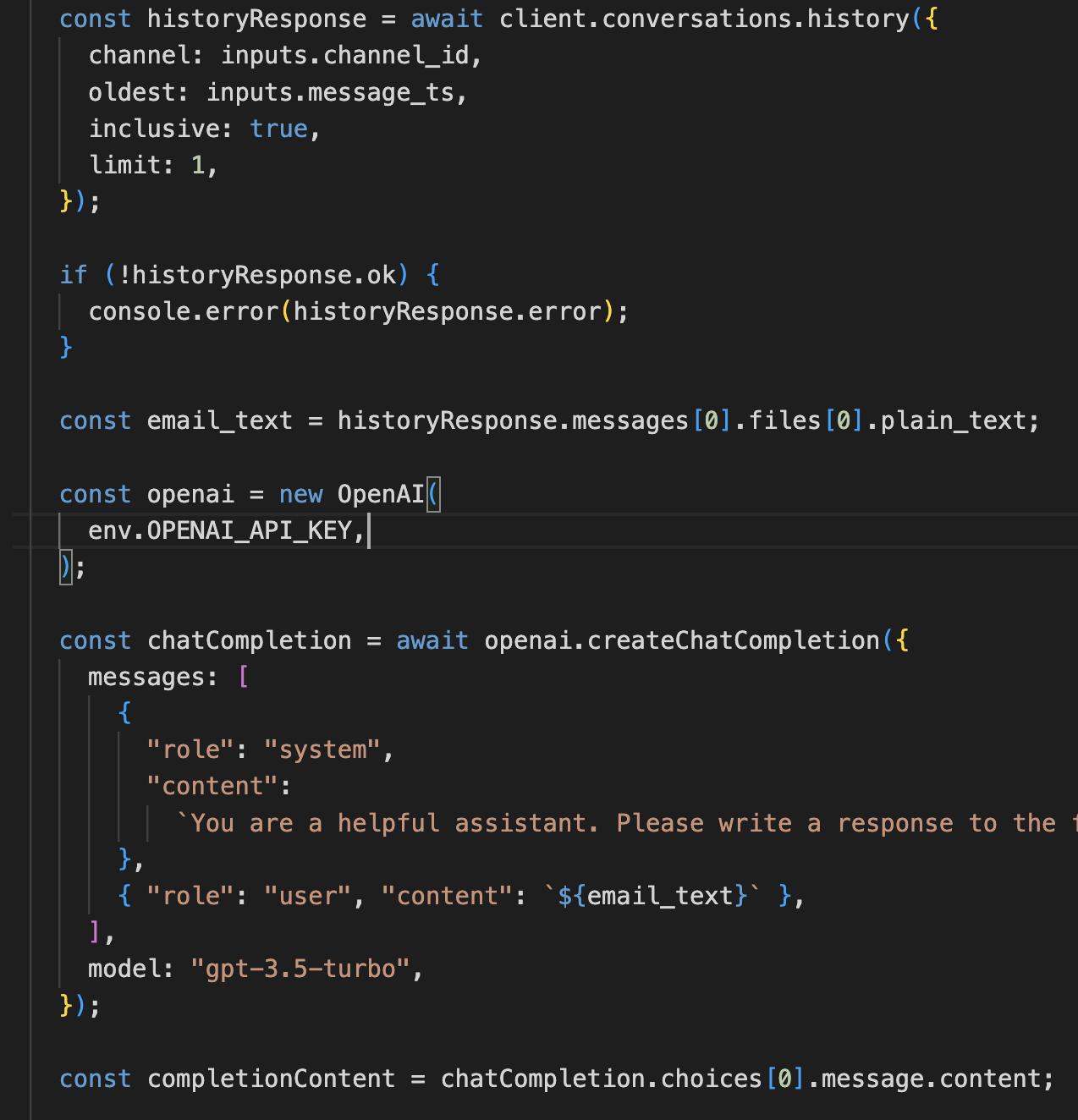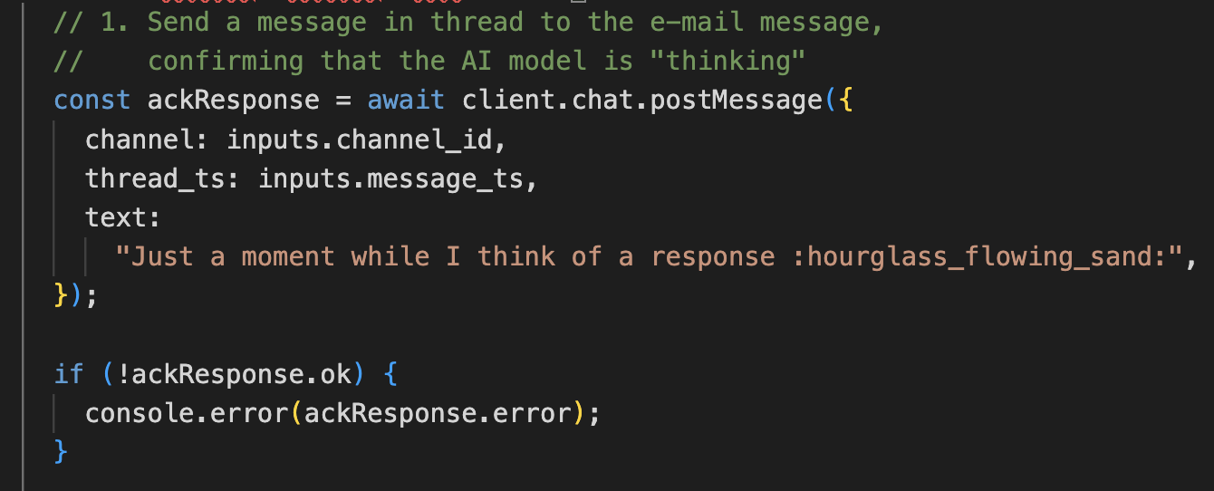 This sends a message letting the user know that something is happening while they wait. Now comes the exciting part: we’ll send the contents of the email to our AI model and wait for its response.