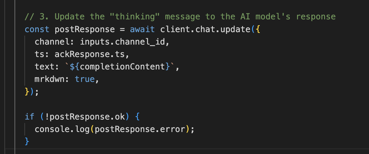 Now, let’s post the AI’s response back to Slack so the user can see it! We’ll update the initial “thinking” message by using the chat.update method, ensuring we reference the same timestamp (ts) as the original message.