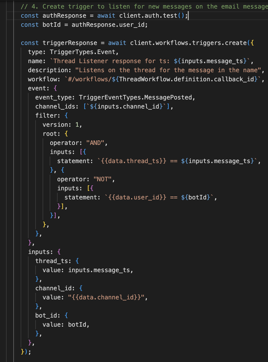 Using triggers.create, we can define all the necessary parameters, making sure to filter out the bot’s own messages and only trigger the workflow for user replies within the thread.