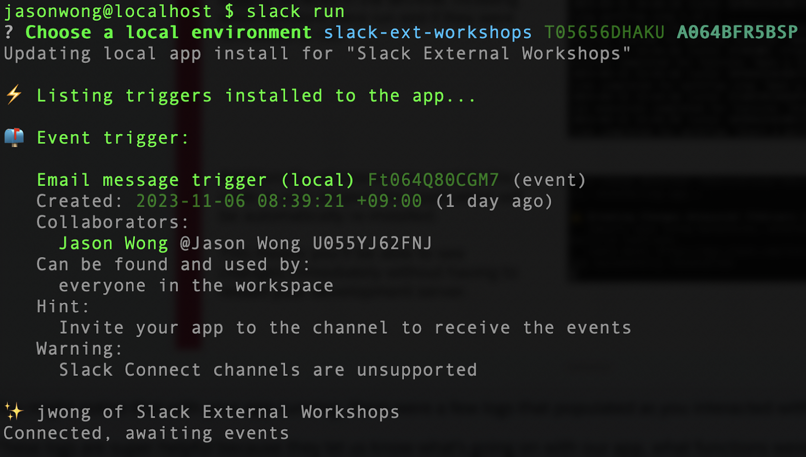 Let’s run the workflow locally using the slack run command. Once the app is up and running, important logs will appear, letting us know what’s happening with the app—such as which functions were executed and whether they succeeded.
